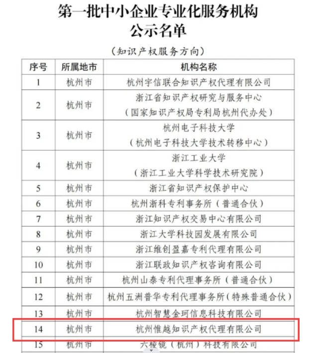 • 喜報!!關于杭州惟越知識產權代理有限公司入選浙江省首批中小企業專業化服務機構的公示